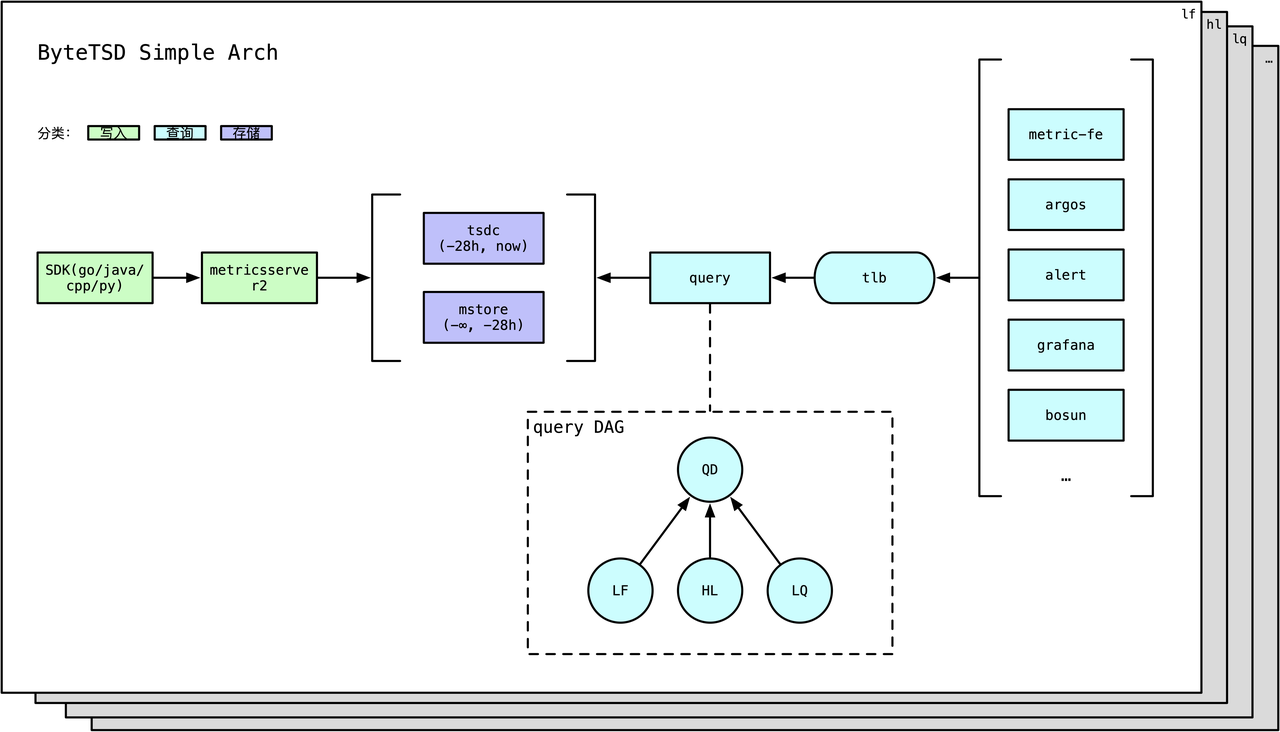 按照时序数据的冷热特点,Metrics将数据按照时间纬度,存放在不同的存储系统: