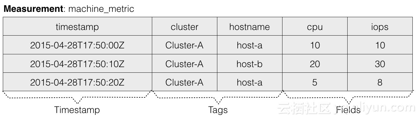 - Measurement:Measurement代表数据所属监控指标的名称。例如上述例子是对机器指标的监控,所以其measurement命名为machine_metric。