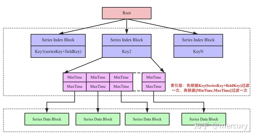 - Index Entry表示一个索引字段,指向对应的Series Data Block。指向的Data Block由Offset唯一确定,Offset表示该Data Block在文件中的偏移量,Size表示指向的Data Block大小。Min Time和Max Time表示指向的Data Block中时序数据集合的最小时间以及最大时间,用户在根据时间范围查找时可以根据这两个字段进行过滤。