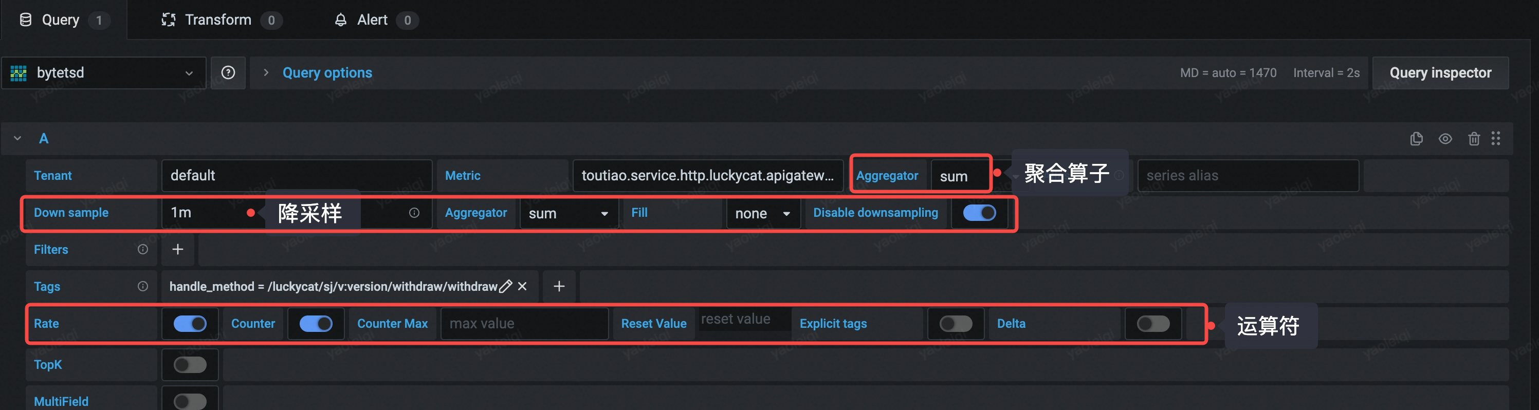 - 举个例子,每分钟新增打点 30 个,rate{counter}对 60 秒求导,30/60 = 0.5,查询时勾上 rate,counter 的情况下的值就是 0.5